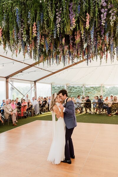 L+C's wedding ceremony took place in the sunken garden at French Park, providing the perfect backdrop for their Midsummer Night wedding. Guests made their way under the white sailcloth tent for the reception where they were greeted with vibrant seasonal blooms and a dreamy overhead installation of flowers showering the dance floor.