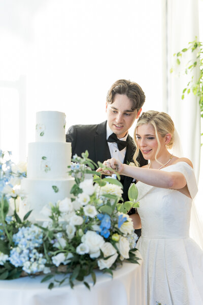 S+M's wedding ceremony took place in the gardens overlooking the charming orchard at Pinecroft Estate followed by a tented reception. The soft white and blue florals were paired with hints of golds that were achieved throughout the wedding. A lush floral garden design defined the wedding, from the ceremony aisle to the cake meadow and dreamy sweetheart table.