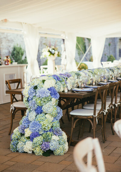 Blue and white hydrangeas blanketed the historic property at Greenacres Foundation for J+I's fairytale wedding. The show-stopping ceremony arch greeted guests as the bride made her way down the winding ceremony aisle. The warm candle glow paired with lush cascading floral runners on the tables created a romantic atmosphere throughout the tent.