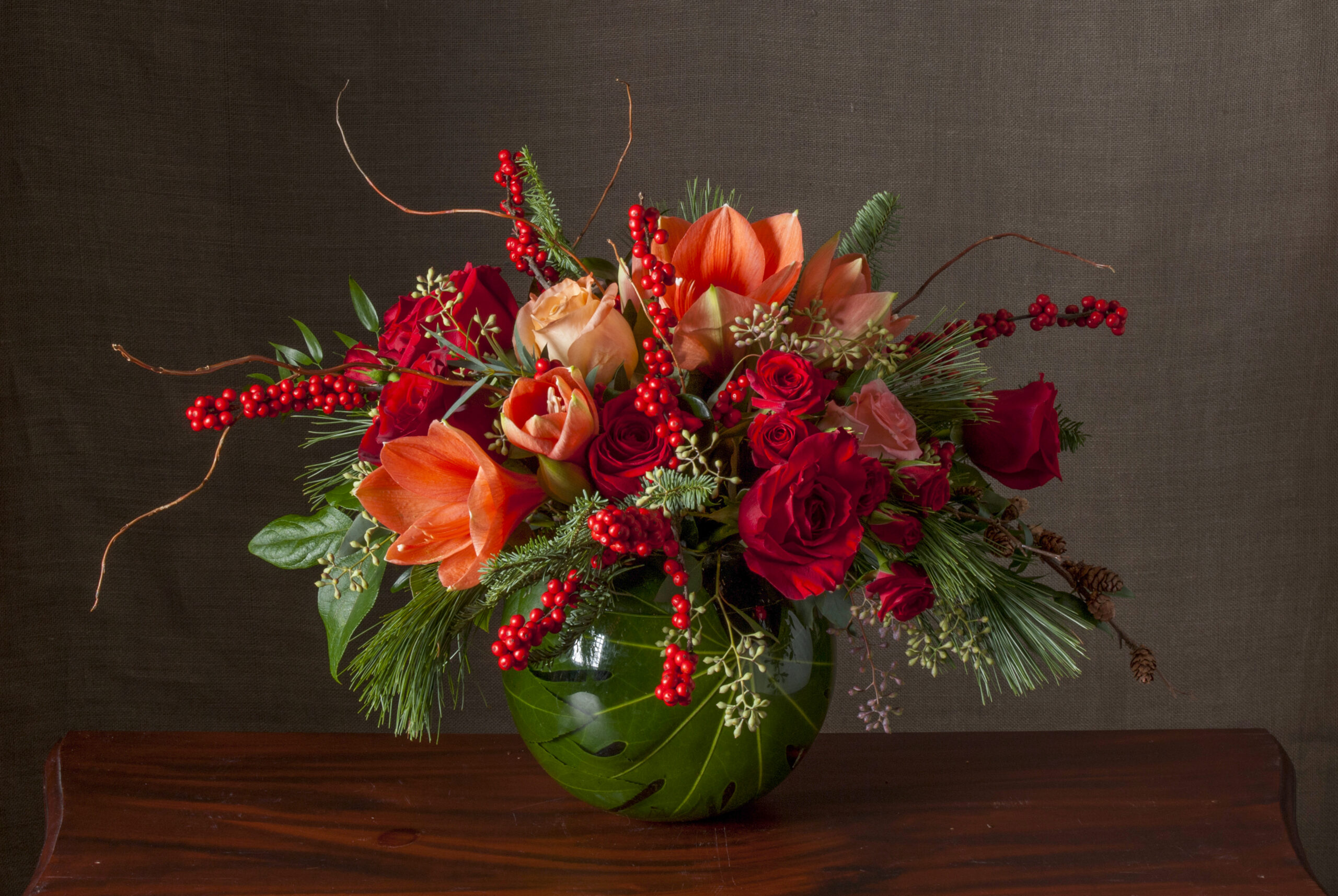 Lush Flowers, Evergreens, and Winterberries in Bright Holiday Color