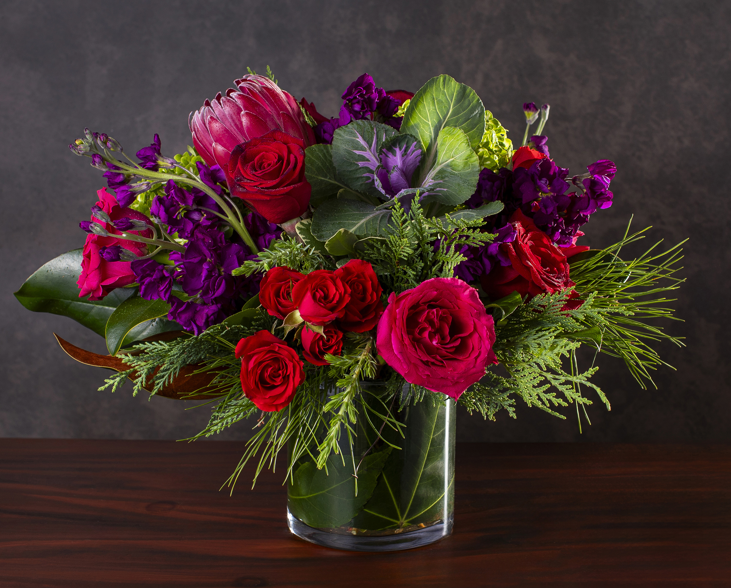 An elegant purple, pink, red and green flower arrangement with seasonal kale, protea and roses with evergreen and magnolia in a clear glass cylinder vase with a leaf wrap.