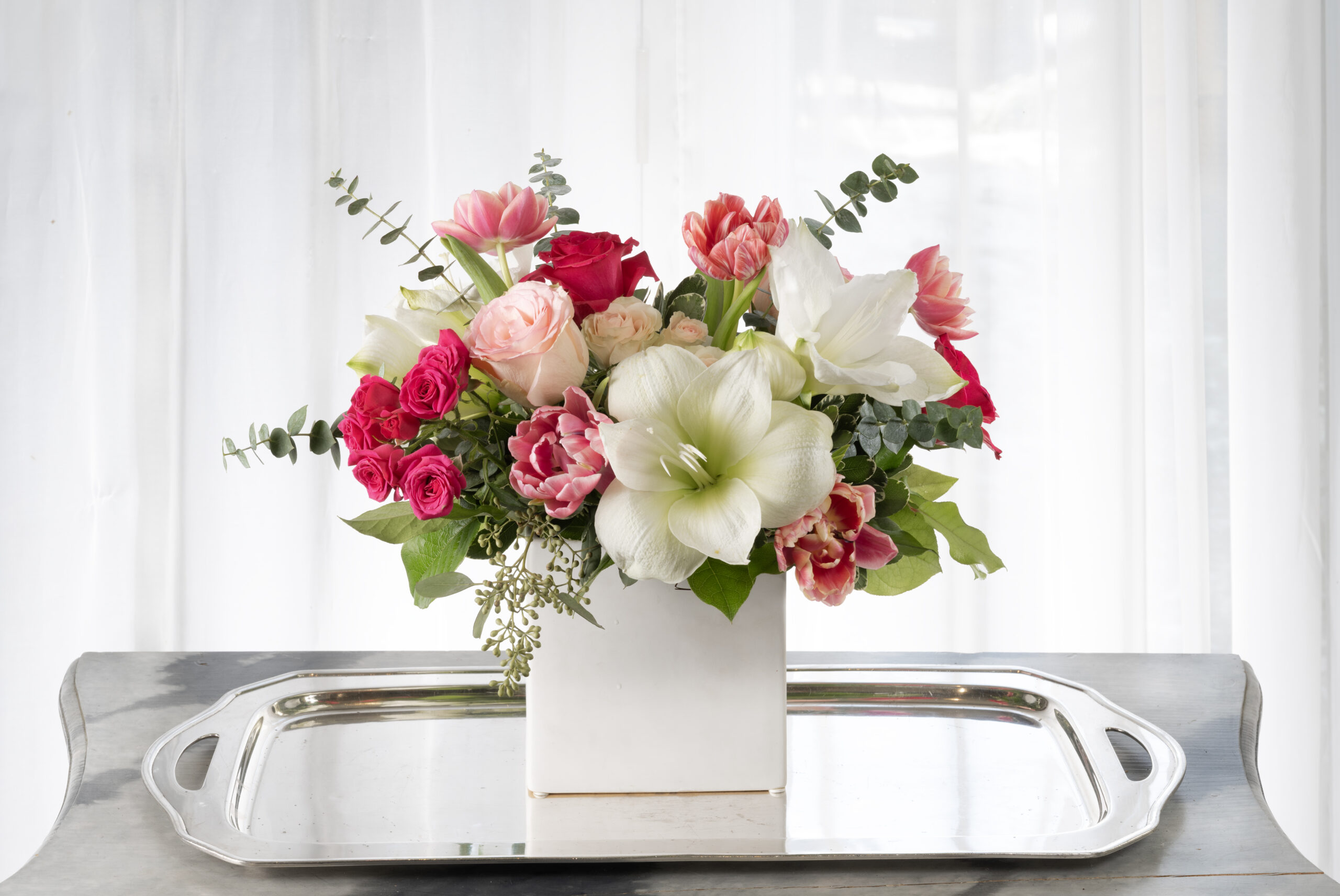 The photos you see on our website are examples of our work. We create unique custom fresh flower arrangements every day using the freshest, most beautiful flowers of the day. We source our flowers from local flower farms, local suppliers, and around the world. Availability of specific flowers varies by season. While we cannot guarantee an exact match to our website, we can promise beautiful flowers delivered to you in the local Cincinnati-Northern Kentucky area.