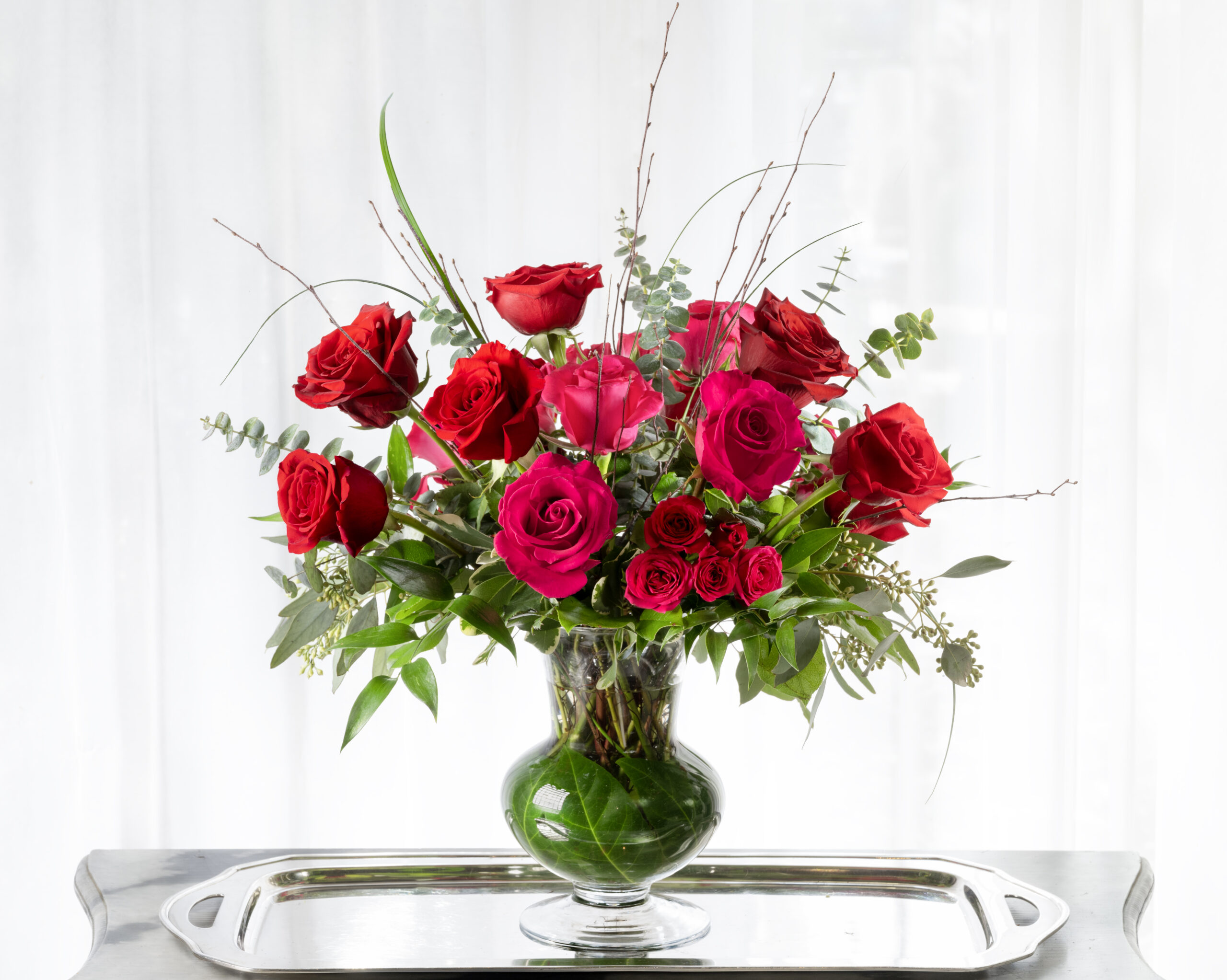 Rose Lovers’ Tall Arrangement of Red and Hot Pink Roses and Sprays