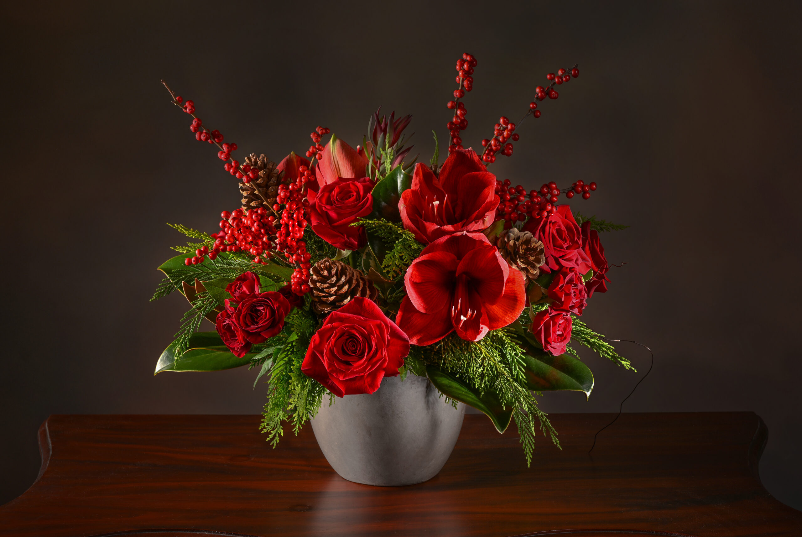 Lush Red Flowers, Evergreens, and Winterberries in Rich Holiday Color