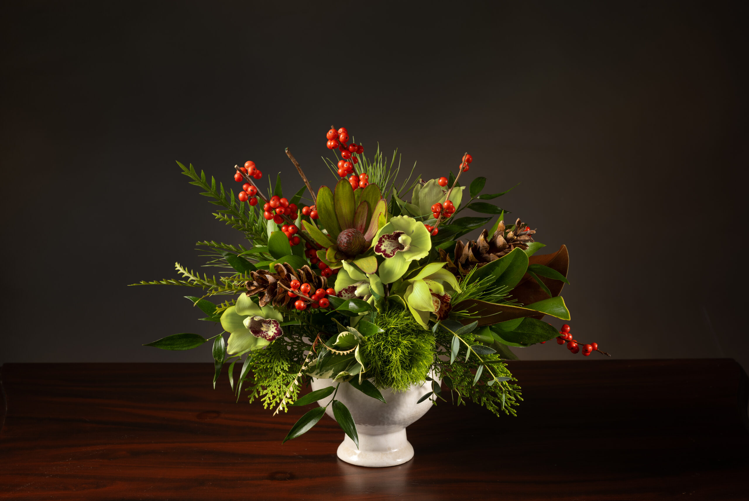 Evergreens, Orchids, and Winterberries Holiday Arrangement in Petite Pedestal Pot