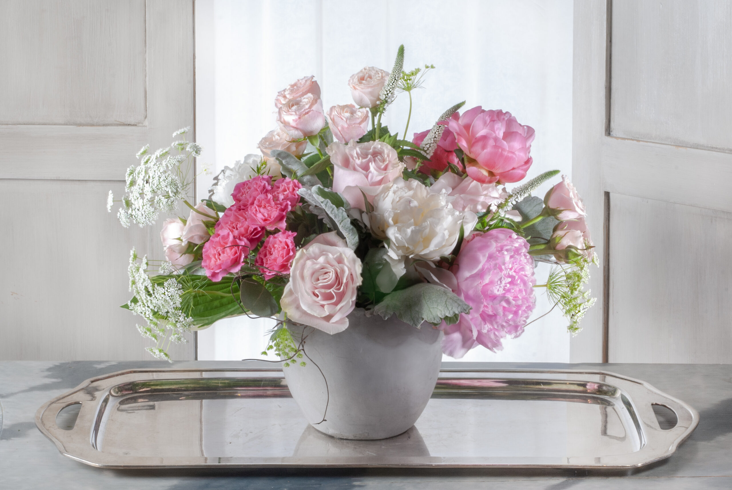 Prettiest Pink and White Peonies and Roses in a Smooth Grey Pot