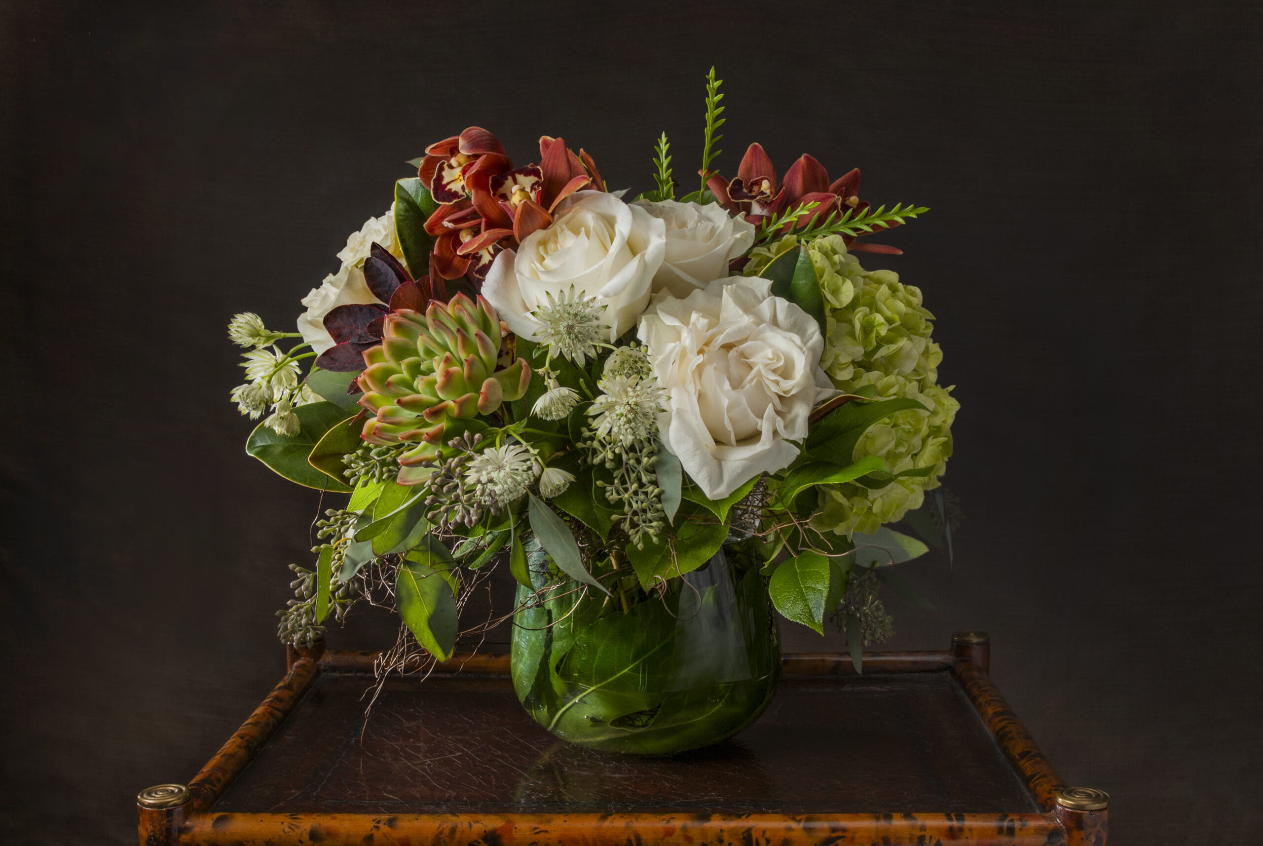 Unique winter arrangement with deep red orchids, white roses, and succulents